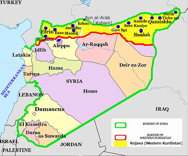 2015年2月24日:図の黄色いシリア北部のトルコ国境沿いの広大な地域をクルド人はロジャバRojava (西クルディスタンWestern Kurdistan)と呼び、この地域には広くクルド人が居住する。激戦のあったコバーネKobaneもそんな街の一つだった。クルド軍は、最終的にはこの地域からISやシリア軍を一掃するのが願いだろう。事実クルド民兵YPG(クルド人民防衛隊Kurdish People's Protection Units )は、空爆やFSAの支援の中、コバーネKobaneを起点に、アレッポAreppo方面,ハサカHasakah方面、ラッカ方面へのIS掃討攻撃を行っている。ハサカ県の北部、トルコとの国境沿いの県都カミシュリQamishliが、YPGが最初に蜂起した中心地で、当初はここへヌスラ戦線が攻撃をし掛け、女性を含む市民が武器をかき集めてカミシュリ防衛に立ちあがった。