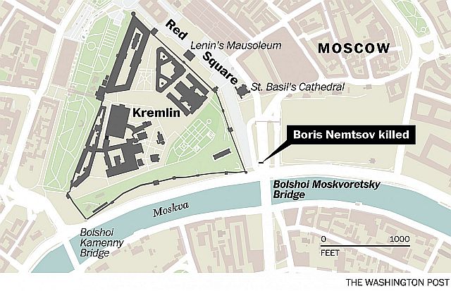 当局へ渡したと語ったともいわれる。だが、カメラはすべてクレムリンの壁(地図の緑色を囲む)に向いており、橋の上が映っている可能性は低いとされる。不鮮明な遠くからのお天気カメラの映像から、暗殺実行犯は橋に隣接する階段(屋根はない。地上からの通路か?)に隠れていて、犯行後近づいてきた車に乗って逃走したと確認されたが、その状況は近づいた排雪作業車snow-clearing vehicleに邪魔されてはっきりと映像から確認できないといわれる。しかし、事件直後の、犯人は路上にいたとの目撃証言とは一致する。3月1日の追悼デモには7万人が参加したと報道された。参照記事
