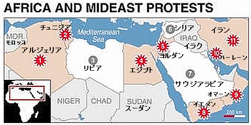 リビアのシリア化とエジプトの治安悪化は予想されてはいたが、また新たな国際紛争に火が付きつつある。どこまで本気か、リビアの過激派は、対岸のローマを占領すると息巻いている。相手が正規の軍隊で無い以上、国連が仲裁もできず、結局武力での鎮圧しか方法はないだろう。 図は2011年2月のブログに掲載した、「アラブの春」で民主化運動から国内紛争に発展した国々で、この頃はまだ、シリアもリビアも深刻な状況ではなかった。ここに見える諸国は現在すべて、深刻な紛争や戦争に巻き込まれている。 過去ブログ:2013年7月先が読めない国 エジプト 2012年12月元大統領の不正蓄財競売に チュニジア 2011年2月2011年2月~アフリカ、中近東、反体制運動と シーア派スンニ派➀ 2009年10月シーア派、スンニ派 今度はイランが、、。また複雑に、、分布図
