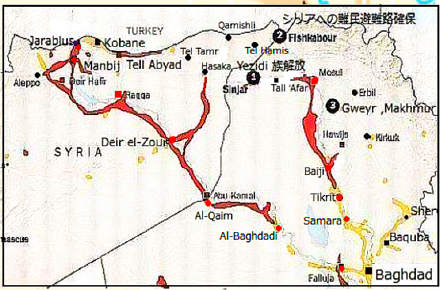 2015年2月23日:21日のクルド側の記事を元に、最近のISのシリア側の状況を記録する。ISのシリアでの活動は、ほとんど右の地図内に収まっている。ISは最近、中東、アフリカのエジプト、リビアにまでその勢力を拡大しつつあるが、シリアではその勢いを無くし、複数の勢力との攻防で支配地を失いつつあり、その影響はISの外国人戦闘員に緊張を強いている。