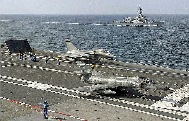 フランス軍は2015年2月23日、イスラム過激派組織「イスラム国(Islamic State、IS)」と対峙する米国主導の作戦の一環として、ペルシャ湾(Persian Gulf)に空母を派遣した。仏国防省高官が23日、AFPに明らかにした。バーレーンの北方沖約200キロ付近をイラク方面へ向けて航行中の空母シャルル・ド・ゴール aircraft carrier Charles de Gaulle からは同日朝、最初のラファール(Rafale)戦闘機が発艦した。 空母の派遣により、アラブ首長国連邦(UAE)にある仏軍基地からISを標的としたイラクへ到達するまでの時間は半減される。仏軍は米軍主導の有志連合を支援するため、昨年9月に「シャマル作戦(Operation