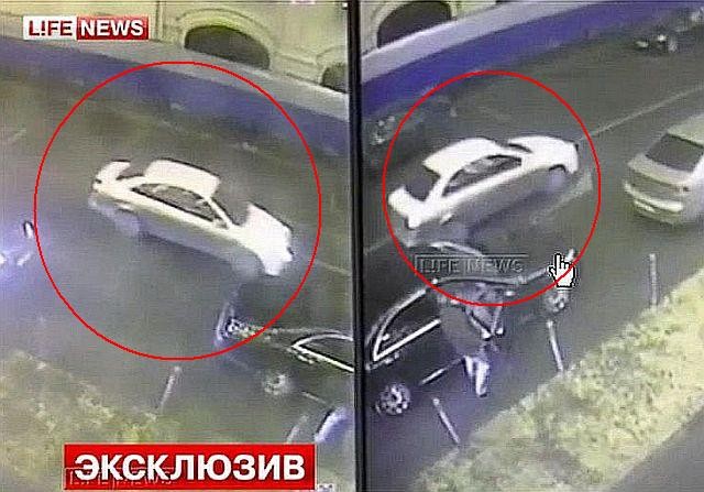 2015年2月28日:ロシア捜査当局は、事件時にいたウクライナ人女性の事情聴取を行い、現場検証から、撃たれた銃弾は6発で、4発が致命傷になったと断定。CCTVの映像記録から、事件時3台の白いフォード車が確認されたが、目撃証言では、犯行に使用された車には、ナンバープレートがなかったとも言われている。注目すべきは、3月1日の反政府デモ直前に殺害されたことで、犯行はそれに対する挑発的行為act of provocationとも言われている。彼の果敢な政治行動はクレイジーとさえいわれたが、多くの人からその人柄が好かれていた。ロシアは事件後、犯人の情報へ約600万円45,000 eurosの報奨金を提示した。写真は、犯行後逃走する白いフォード車で、現場からそう遠くない場所で見つかった。 参照記事 参照記事 参照記事