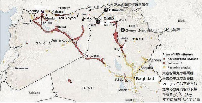 シリア軍の最も東の陣地であるデリゾール空軍基地Deir el-Zour air baseで、ISは幾度もの奪還攻撃に失敗しているが、攻撃は今も続行されている。(デリゾール市はまだIS支配下にある)これらのことで、戦況が変化したと言うにはまだ早いが、国際的な連携が強化され、今後西のアレッポから、東のイラクの首都バグダッドまでの、長くのびた戦線をISが維持するのは困難にみえる。図の濃いあずき色は、ISの主要な制圧地域を戦線として表示したもの。ここ数日の公表された戦況図が無いため、過去の戦況図を元に、最近の記事から筆者が編集したものです。大体の状況図とお考えください。ベージュ色の地域でも、バグダッド周辺などで爆弾テロは頻発しています。