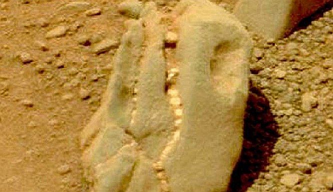 拡大すると、砂に埋まっている頭蓋骨と、鼻の穴が見える。なお、NASAの画像では、生き物のからだの他の部分は見当たらない。画像にうつっているものが石ではなく、生き物の頭蓋骨である証拠となったのは、歯だった。古生物学者たちは、歯について、形と大きさから、草食動物のものであるとの見方を示している。参照記事 YOUTUBE映像 英文記事