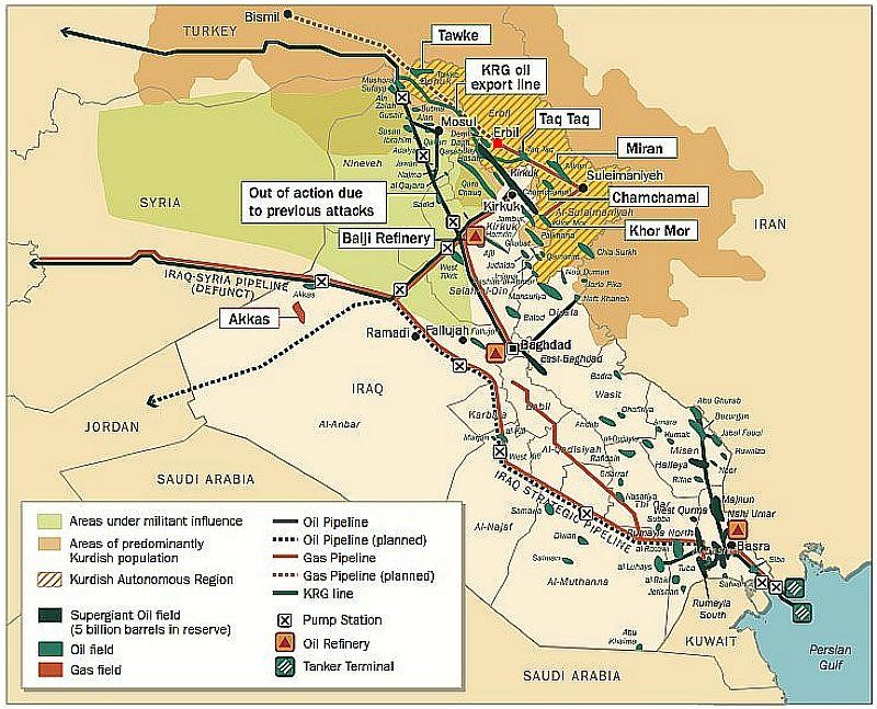 クルド側の言い分は、イラク側が取り決めに沿って支払いを行っていないことによるものだと強調し、クルド政府はすでにイラク政府に対し、クルドから原油を買うのか、2014年の取り決めを破棄するかの選択を迫ったと報じている。上の図は、緑色で原油とガスのパイプラインを示している。緑色の帯が油田地帯。上の地図の、緑はIS影響地域、茶色は、クルド人の居住分布を示している。