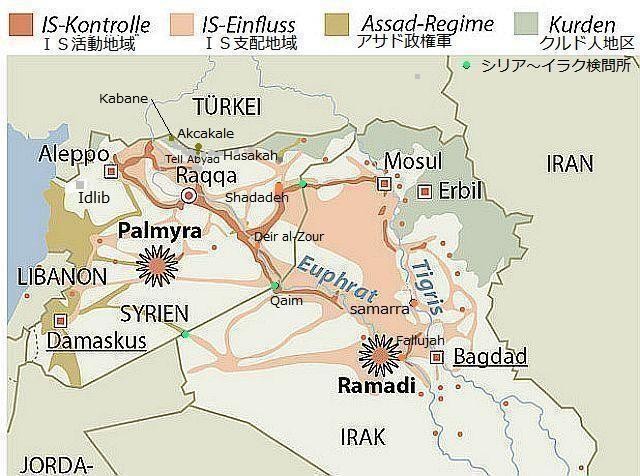 クでは、ISが9歳から18歳までの少年兵500~800人に対して軍事教練を行っていると報告されている。 参照記事 参照記事 参照記事 過去ブログ:2015年6月ISが「水戦争」を仕掛ける イラク 6月無差別攻撃を繰り返すシリアは分断国家になるのか、、。2015年6月25日:右下の地図は、ロイターの地図をベースに筆者が独自に編集したもので、シリアのクルド合同軍が、ラッカ方面に南下し、ラッカ北部50キロに迫っている状況を表している。パルミラでは、ISが遺跡破壊を始めたとの報道がある。各地のISの拠点への空爆は続行されているが、ラマディへの攻撃は、イラク軍の体制再編のため停滞している。参考写真:パルミラの世界遺産