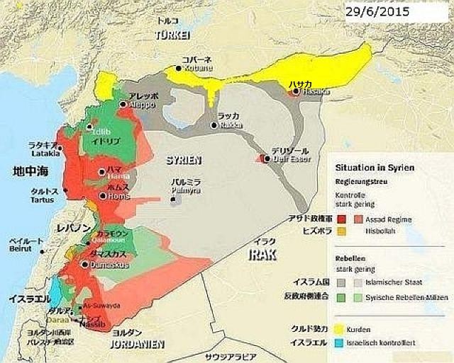 シリアについては、西側などの当局者の多くは、米ロと地域大国の間などシリア以外の場所で、今後に向けた大枠が決まるとみている。それには、訴追免責などアサド政権側への譲歩が含まれるかもしれないと予想している。よく言われるのは、アサドを退陣させ、新政権のもとに新たな多民族国家としてシリアを再生させる案だが、個人的にはイラクより難しいのではと思っている。その時の、北部トルコ、南部イスラエル、西部レバノン、の出方が読めず、東のイランがどのように介入して来るか予想も付かないからだ。さらに、ロシアのプーチン大統領が、「シリアをリビアやイラク化させないためにアサド政権を擁護する」との発言を繰り返していることは、欧米と大きな対立を生むだろう。 参照記事 参照記事 参照記事シリアでは最近、ISによるラッカRaqqaからトルコ側へ、またコバーネKobaneへの攻撃は失敗したが、シリア政府軍のいるハサカHasakehへのISの攻撃が再燃している。シリア軍はデリゾールDeir ez-Zor近郊の飛行場も死守している。イラクでは、キルクークKirkuk南部、タル・アファールTall・Afarへの空爆で多数のIS兵士が殺害されているが、米軍は幾度か、空爆だけではISはせん滅できないと発言している。ISは、米軍が空爆を避ける民間居住区に多くが潜伏しているからだ。いい例がシリアのラッカRaqqaで、米国はラッカ中心部にあるISIS本部や作戦司令部があるとみられる複数の建物を確認したが、近辺に民間人が居住しているため空爆に踏み切れていないという。米情報機関によると、ISISはラッカ市の北部方面でクルド軍の接近を警戒し防御態勢を強化している。同組織がこれまでの防御戦術で見せてきた塹壕(ざんごう)や障害物の構築、仕掛け爆弾の設置などが目に付くという。イスラム国がカリフ領土を主張して攻撃を開始してから、6月29日で1年になる。参照記事 過去ブログ:2015年6月ISがトルコ側から侵入、シリア北部で反撃に出る シリア