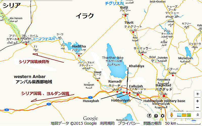 カーター米国防長官は2015年6月17日、下院軍事委員会の公聴会で、イスラム過激派組織「イスラム国」掃討作戦に関連し、今秋までにイラク軍の兵士2万4000人を訓練する計画に対し、現時点では9000人にとどまっていることを明らかにした。現状では計画が大幅に遅れていることについて「イラクでは訓練を受ける人が不足している」と説明し、イラク政府に対し「さらなる取り組み」を要求した.。米軍はアンバル県Anbar provinceのタカドム基地Taqaddum military baseに拠点を設置し、スンニ派民兵を積極的に勧誘し、強化を進める方針だ。参照記事 英文記事 *タカドム基地Taqaddum military base(Al-Taqaddum Air Base)の位置は、以前にハバニヤー基地 Habbaniyah military baseと言われた、ハバニヤー湖東岸の場所と思われる。