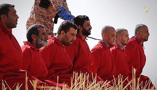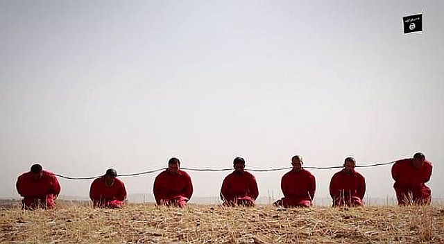 入ったプールに沈められた: Execution by drowning。3番目の映像では、男性7人がひざまずかされ、それぞれの首に爆発性のコードが巻かれているのが映る。その後、コードが爆発し、7人の頭部が切断される:Execution with booby trap。3番目はISがこれまでに公開した中で最も生々しい映像の1つだ。ISは宣伝活動の一環として、残忍な処刑映像を流すことで知られている。ISに対するスパイ行為を思いとどまらせたり、影響を受けやすい戦闘員候補を集めたりすることが目的だ。処刑された容疑者たちは、米国、有志国軍が空爆攻撃するイラク北部モースルMosulの標的の、正確な座標をパイロットに教えていたと映像のナレーターが語っている。参記照事 参照記事 英文記事 英文記事 ニュース映像からの処刑シーン彼らの罪状はスパイである。言い換えれば米国の空爆に対する、直接は武器を手にしない、一種の「後方支援」である。後方支援とはいえ、兵士を戦場に送り込めば、このようなことも派遣国は覚悟しなければならないだろう。