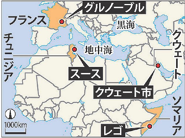 上記のフランスのほか、26日にはチュニジアでの観光客38人殺害、クウェートでのモスクでの自爆テロで27人死亡、ソマリアでは平和維持部隊が「アルシャバブ」の襲撃を受け50人が死亡などで、4カ国で26日に相次いだイスラム系によるテロ・襲撃事件の死者は少なくとも計116人に達した。過激派組織「イスラム国」は27日までに、チュニジアとクウェートでのテロの犯行声明を発表した。過激派組織「イスラム国」(IS)が「カリフ制国家」樹立宣言から6月29日で1年となる。 参照記事 記録映像:チュニジアのビーチでの惨劇