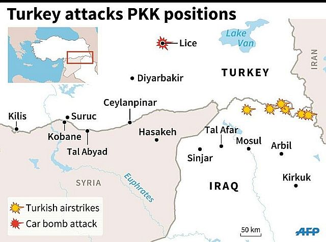 24日、トルコの2度目の空爆では、隣国イラク北部にあるPKKの拠点も爆撃のターゲットとなったと報道された。クルド自治国家は、トルコとの経済関係を強化しつつあり、これが事実なら自治領内に拠点を移したPKKとの関係に暗雲が立ち込めたようだ。参照記事 過去ブログ:2015年3月クルドPKKとトルコに歴史的雪解けか? 2013年4月クルド人組織PKK 2013年5月8日からトルコ領より撤退 2008年3月:トルコ vs PKK (6) 2月:新しい戦争、名前はまだ無い。(2) 2008年1月:イラク北部クルド人自治区と国際紛争(1)修正 トルコーPKK戦争(4) トルコとPKK(5) 2007年12月クルド労働者党(PKK)、闘争の23年間