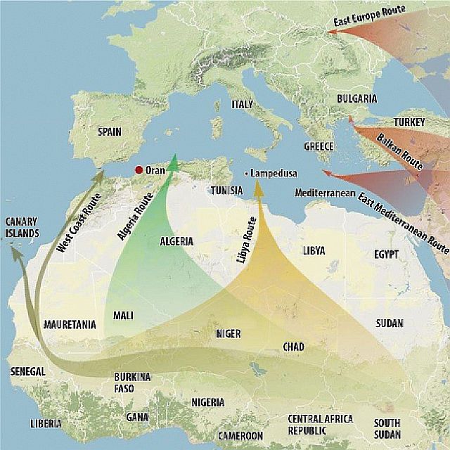 2015年上半期だけで、7万9000人の違法移民がトルコ経由でギリシャにわたり、一部はギリシャの残るが、マケドニア、セルビアを抜けて、違法に6万7000人が違法にハンガリーに入国したとされる。2015年だけですでに8万1000人がハンガリーに違法入国し、2015年末までには、その数は15万人になるだろうとハンガリー政府が公言している。この移民の急増は、各国で右翼組織、民族主義の台頭を招いていて、暴力的な排斥運動も引き起こしている。もうひとつの大きな違法移民ルートが、北アフリカから地中海を渡りイタリーなどから欧州に入る経路で、2014年には17万800人が確認されているが、2015年には50万人から100万人がこのルートで欧州へ渡ると推測されている。さらに北アフリカからジブラルタル海峡Strait of Gibraltarを渡るスペイン経由の違法移民も2014年には7840人が確認されている。参照記事