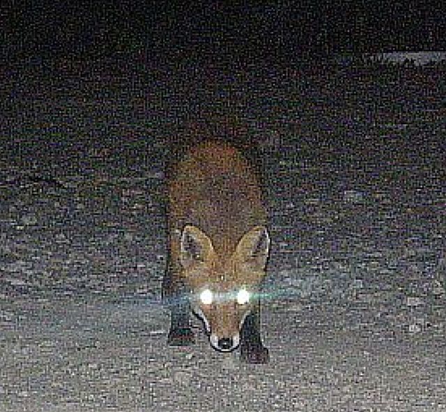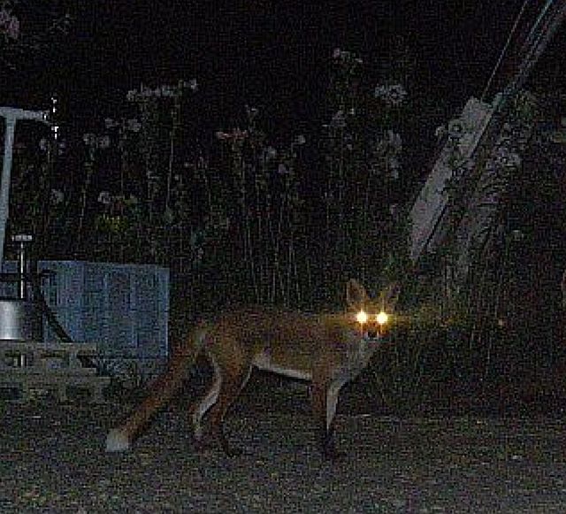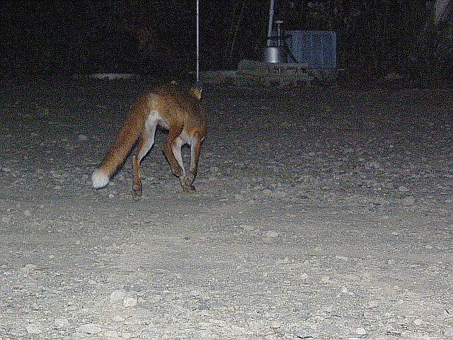 どうしても写真を撮りたいので、暗い中、なんとか撮ろうとシャッターモードの切り替えに苦戦していると、これまで一度も近寄ってこなかった臆病なキツネが近づいてきた。何度か、セイヤと自分が接近しているのをこのキツネは目撃しているので、学習して安心したのだろう。その時撮った写真が右と下過去のセイヤ写真と比べると、このキツネの大きな特徴は、尻尾の先が7~8cmほど白い事だ。体系