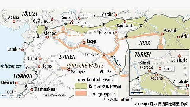 ジュの住民は食料や医薬品をコバーネKobaneに送り込み支援を行った。トルコ内には多数のIS支持者が活動しているといわれ、6月には、トルコのクルド人政党pro-Kurdish Party, HDPが、IS組織からと思われる攻撃を受けている。映像記録 映像つき記事 上の図は、最近のニュース情報から、筆者が独断で支配地域などを編集しています。各メディアにより、判断に違いがありますので、参考図として見てください。トルコ内務省はこの爆発を「テロリストによる攻撃」だと非難している。シュリュジュは、トルコ国境に近いシリアの要衝の町アインアルアラブ(Ain al-Arab、クルド名:コバーネ、コバニ、Kobane、Kobani)と、国境を挟んだ反対側に位置する。 関係者らは自爆攻撃の可能性があると述べており、地元メディアのコメンテーターの間からは、イスラム過激派組織「イスラム国(Islamic State、IS)」の犯行ではないかという意見が上がっている。