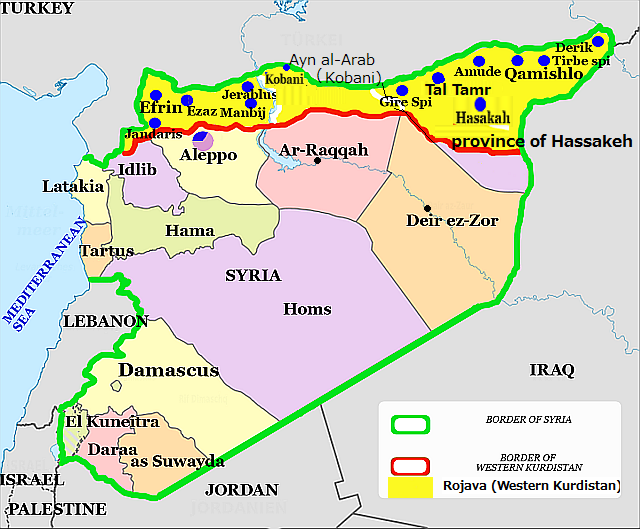 サカ市Hassakehに駐留していたシリア政府軍は撤退し、付近の戦闘はクルドYPGとISの間で繰り返され、ISに占拠されているパルミラPalmyraへはシリア政府軍が奪還作戦を展開している。また、米国、有志国軍によるラッカRaqqaへの空爆が強化されているようだ。気になるところでは、コバーネでクルド側と共にISとの戦闘に参加した反シリア組織FSA自由シリア軍が、クルド側からコバーネKobaneからの撤退要請を受けたと報じられたことで、シリア北部トルコ国境沿いのロジャバRojava (西クルディスタンWestern Kurdistan)地域一帯(地図の黄色)をクルド人国家、あるいは支配地域に望むクルドと、あくまでもシリアの一部として見るFSAとの間に温度差が生じたようだ。アラブ系のシリア人とクルド人との異民族問題もあるかもしれない。過去ブログ:2015年3月コバーネ周辺のISは敗退 シリア