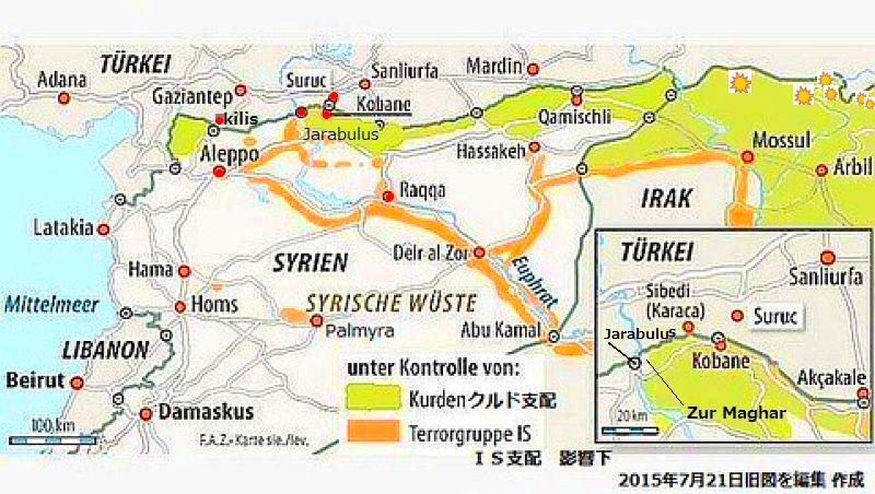 右の図は、筆者が編集したもので、緑色が最近までのクルド側制圧地域としている。記事の説明から行くと、コバーネKobane西部、ユーフラテス川を挟んで西側がジャラブルス(Jarabulus)で、その対岸側にZur Maghar村あると理解できる。この村付近まで、最近YPGがISを追い詰め、ISは陣地をジャラブルスまで一旦後退させたというのが戦況で、戦況からは、この東岸付近の村にISが残留していても不思議はないので、クルド側が陣取ってっている地域のど真ん中に砲撃したという状況ではないように思われる。ISとYPGが、この村付近を最前線にしているのは間違いなく、トルコ側が弁明している、クルド側に砲撃したのではないというのも、このような、クルドとISが接近した状況ではあり得る事だろう。7月21日に編集した上の戦況図では、クルド側はユーフラテス川まで到達していないとして空白にしてある。空白部が丁度Zur Maghar村付近に当たる。