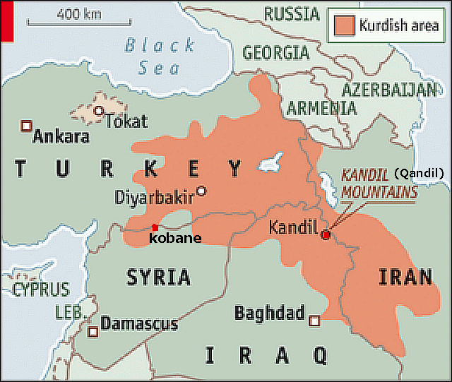 は、左翼組織「クルド労働者党」PKKを組織し、トルコ東部の分離独立闘争と反政府活動を1984年から展開している。PKKは現在トルコと停戦し、トルコ領から2013年5月に撤退して、KRGの配慮で今はイラクのクルド自治国家北部カンディル山岳地帯 Qandil(Kandil) Mountainsの約50平方キロに拠点を移しているが、歴代のトルコの政権はPKKを「テロ組織」と名指し、クルド人、特にPKKの勢力拡大をトルコの安全保障上の脅威と捉えている。地図は、クルド自治政府地域のPKKの現在の拠点Kandil Mountainsと、ピンク色がクルド人の分布地域 映像記録:第一次世界大戦 勃発から終焉まで 過去ブログ:2015年1月コバーネにPKKの旗はひるがえるのか?シリア イラク2011年からのシリア紛争が激化する中、シリア北部のクルド人組織「民主連合党」(PYD)の軍事部門「人民防衛部隊」(YPG)がシリア北部でISとの戦闘に突入し、米軍の空爆支援の下、コバーネKobaneでISを撃退し、IS側はこの戦いで2000人ともいわれる戦死者を出す大敗北を喫した。この戦闘では、イラク内クルド人自治政府の軍事組織「ぺシュメルガPeshmerga」もYPGに合同して北部のIS戦闘員を撃退するなど活躍し、世界にその軍事力を見せつけ、このISとの戦闘は今も、シリア、イラク