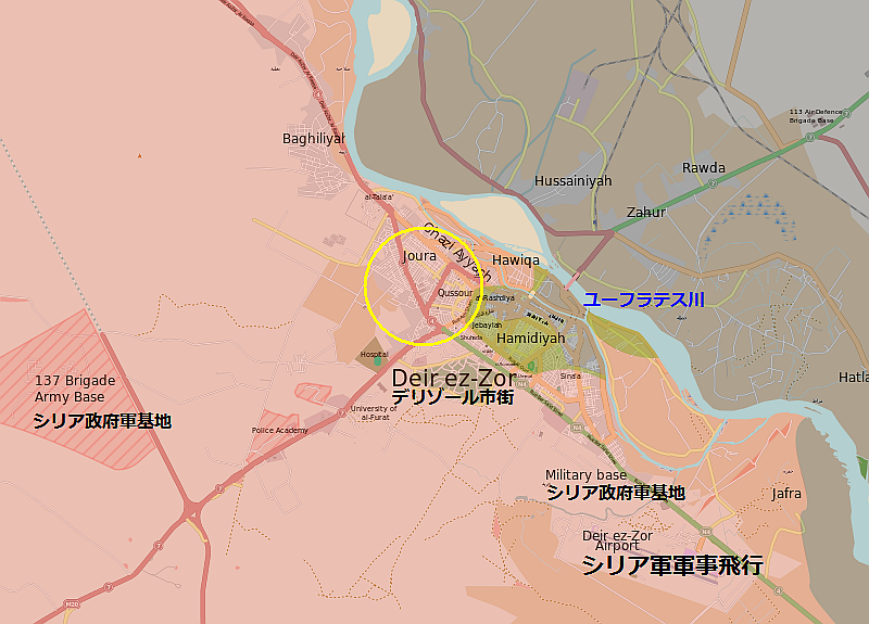 2015年7月24日:シリア東部のハサカ市Hasakehに駐留していたシリア政府軍は撤退し、周辺ではクルド軍とISの戦闘が行われているとすでに書いたが、撤退したシリア軍の多くはデリゾールDeir ez-Zorへ移動したといわれている。すでに長いことこの付近はISに制圧されているが、市を2分してシリア政府軍とISが対峙している。シリア政府軍が死守するのは、図のようにこの周辺に軍事基地、軍事飛行場などの重要施設があるからで、最近、市の西部Jura(Joura) とQusour地域がISに包囲され、食糧の不足から子供が餓死する事態になった。人道的支援組織がユーフラテス川沿いに食料や委託品を届けに活動したが、7月22日、少なくても6人がISに発見され、銃撃を受けて死亡した。ISは空路での補給路確保のために、シリア軍の飛行場を狙っているとの説もある。参照記事