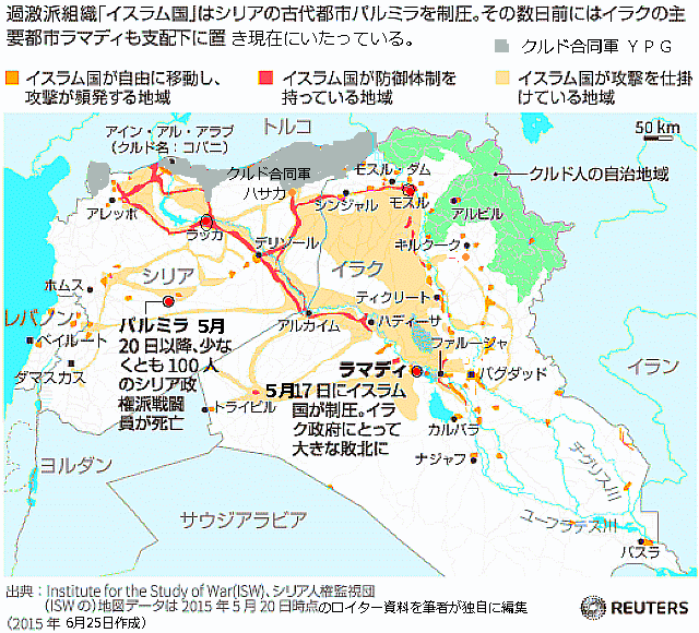 2015年7月25日:6月から7月にかけてのラマダン、断食期間中もイラク内の空爆は止まず、特にラマディRamadi周辺、ファルージャFallujah周辺、ファルージャの西al-Karmaへの攻撃が報告されている。米国防総省は7月23日、イスラム過激派組織「イスラム国(Islamic State、IS)」からイラク西部のアンバル(Anbar)州の州都ラマディ(Ramadi)を奪還することを目指して実施中の戦闘