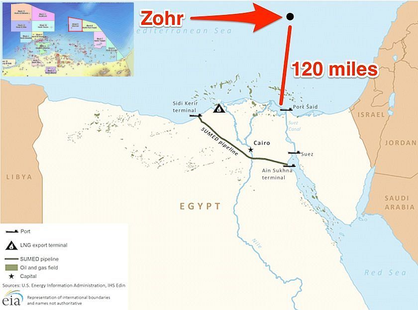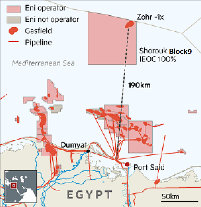 欧州で、ガス、石油開発では最大手のイタリアのエニENI社は2015年8月30日、地中海(Mediterranean)で見つかったものとしては超特大"supergiant"の海洋ガス田を、エジプト領海約190キロ(120マイル)沖で発見したと発表した。 エジプト石油省も、同ガス田の発見を認めた。ENIの声明によると、シュルーク(Shorouk)海上鉱区のゾール試掘井Zohr Prospect( Zohr 1X NFW well)で、深さ1450メートルに位置する