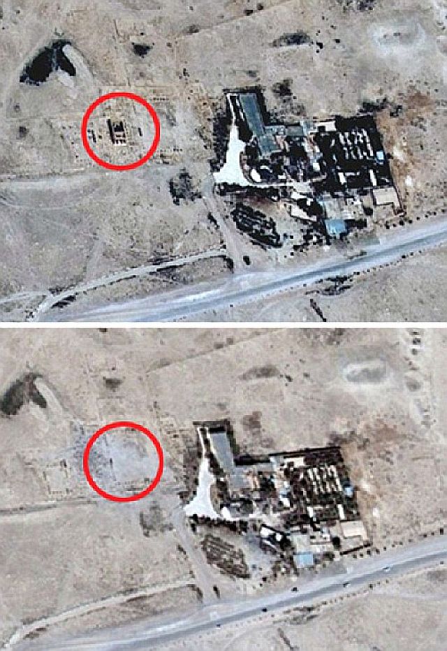 つ歴史遺産をことごとく破壊している。その一部が衛星写真で確認された。赤い丸の バールシャミン神殿The temple of Baalshamin(写真左上は破壊前の神殿)は、8月18日に考古学者のハリド・アル・アサド(Khaled al-Assaad)氏がパルミラPalmyraで殺害され、死体が、彼が数十年の間にわたって管理してきた博物館の前に広場につり下げられた日から5日後の2015年8月