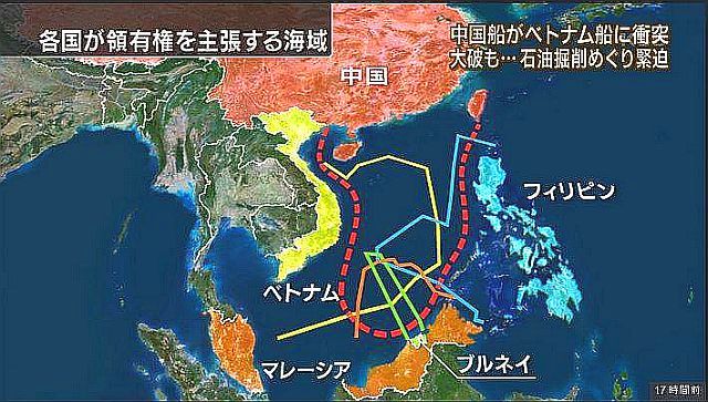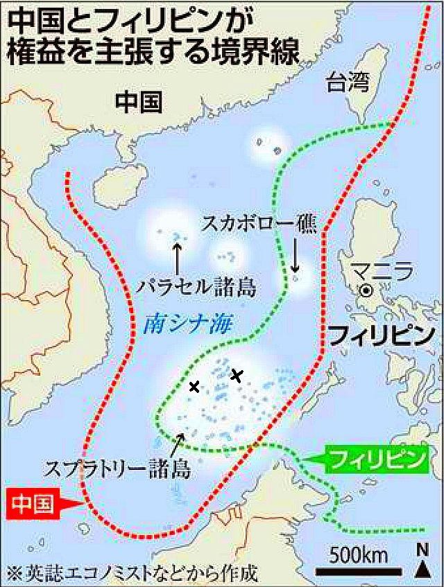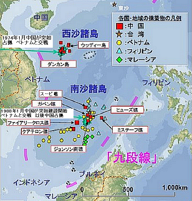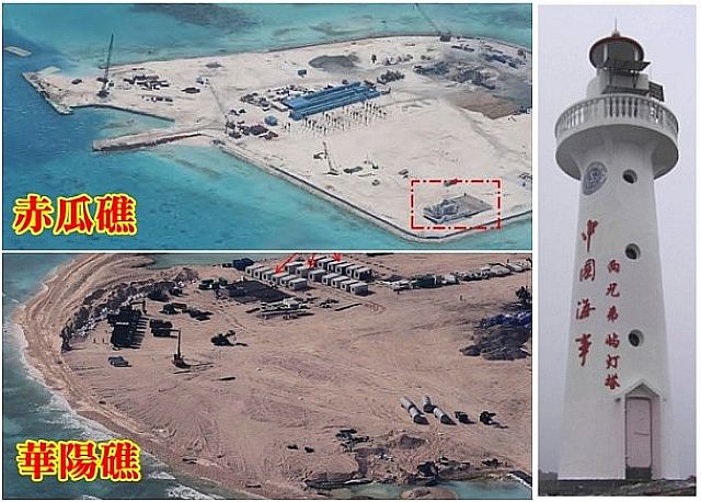 南沙(英語名スプラトリー礁)諸島の、スービ(中国名・渚碧)礁、ミスチーフ(美済)礁は、中国による埋め立て工事前は満潮時に水没する暗礁で、国際法上、領海(領土)とは認められない。