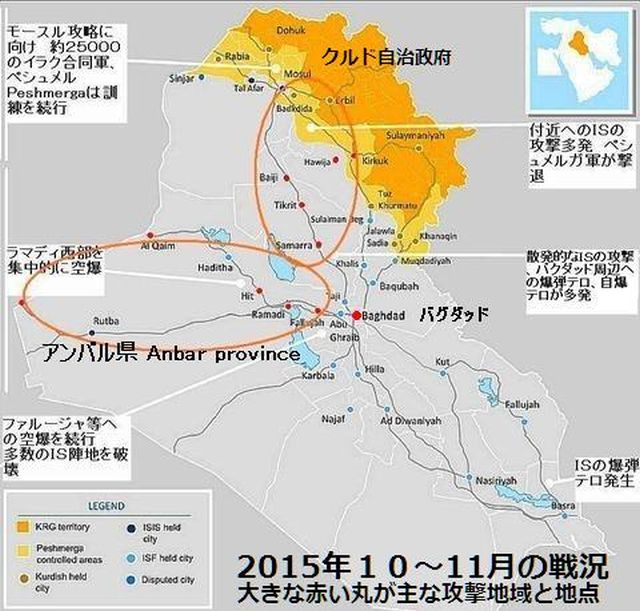 うな発言を何度も聞かされているので、本当に作戦が行われるのは懐疑的だが、より犠牲の少ないよい結果を期待しよう。過去ブログ:2015年12月イラク北部の空爆でIS200人以上殺害か? ラマディ制圧が進行 米兵200人も到着 イラク 2015年3月敗退するISと2015年3月の戦況図 イラク2015年12月22日:ラマディ開放作戦の指揮官は22日、ラマデ中心部、南部、さらに北部のイラク合同軍はモースルMosul北部、ティクリートTikritなどで空と地上から攻撃を開始し、多くのIS兵士を殺害したと報告している。作戦はイラク全土で同時に行われたようだ。