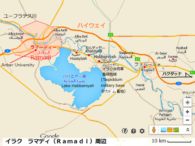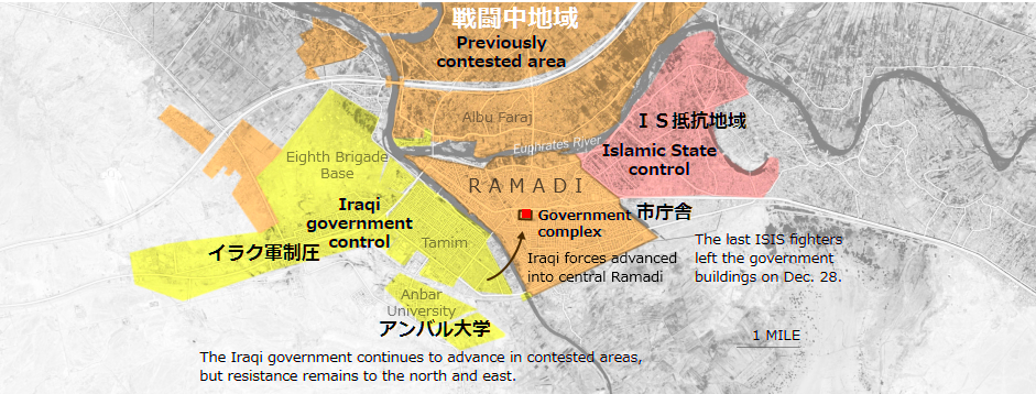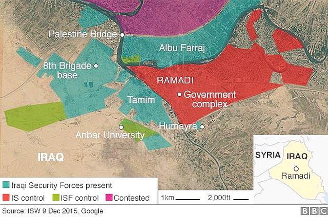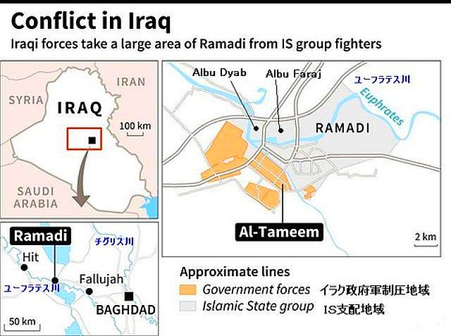 2015年12月29日:ラマディ制圧表明の翌日29日、Haider al-Abadi首相がヘリでラマディ視察に向かった際に、市内から銃撃があったとされる。ヘリとの距離は遠く、首相はラマディ南部のアンバル大学敷地に無事着陸した。 下の地図は、ラマディ市内へイラク軍が南部から侵攻直前の戦況で、ISは市の東部(ピンク色)へ移動したとされる。黄色が政府軍制圧地域 茶色は戦闘中 地図は、12月28日のニューヨークタイムズ紙より 参照記事 参照記事