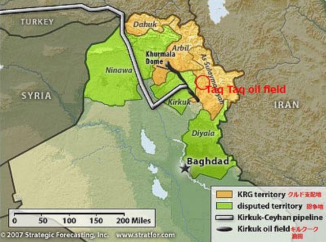 発もあるはずで、状況はかなり複雑だ。トルコがイラクに強引に侵入したと言うより、トルコ経由での原油輸出(2015年1月より開始)に頼る財政難のクルド自治政府が、クルド人居住からのIS排除にトルコの機動力を要請したのではなかろうか?トルコは、イラクへの兵員派遣はイラク政府の了解で行っていると話しているが、何かうそ臭い。地図は、クルド地域からの石油パイプラインを示している。イラクの最大の懸念は、クルド自治政府の、紛争後の軍事強大化で、クルド人地域であ