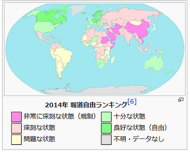 日ごろ海外の情報を多用する筆者のブログでは、現地取材の記者の苦労に頭が下がる。外信からの買い入れ記事の多い日本の記事では、海外の事件の詳細の分からないことがほとんどで、現地取材など期待もできない。世界の多くのことを多面的に知ることは、視野を広げることになる。その目で日本を見ると、日本の良い点も悪い点も立体的に見えてくる。世界報道自由ランキングで日本は、2010年まで一桁台の指標が続き世界の中でもトップクラスの順位を誇っていたが、近年の福島第一原発をはじめとした報道の不透明さや政府などから開示される情報量の少なさ、記者クラブ制度の閉鎖性、2013年には政府情報の隠ぺいを可能にしたとも受け取れる特定秘密保護法の制定などから信頼を失墜し、年々指標を下げ続けており、順位も11位から59位まで落としている。報道に関し日本は「問題な状態」に指定されている。先進国の中では特に悪い状態で、G7の中では最下位まで転落した。