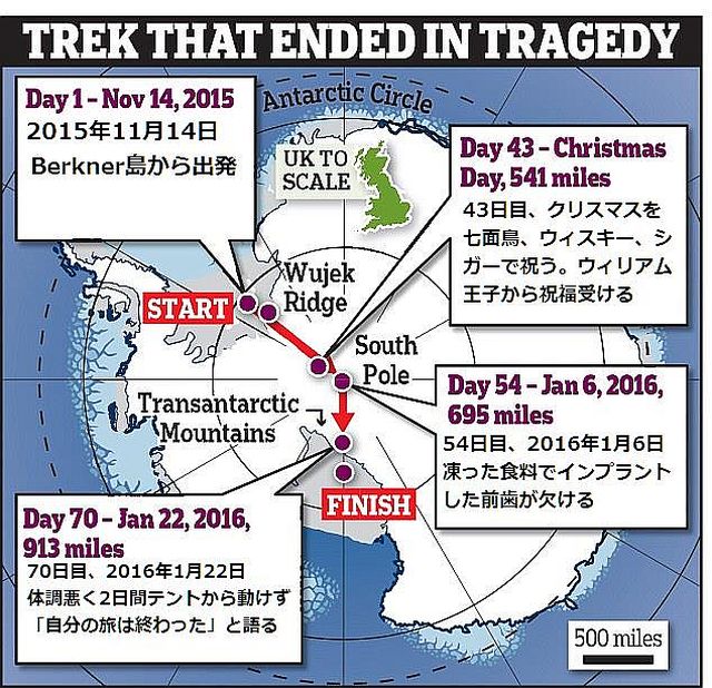 どんな小さな冒険でも、する人には敬意を表する。まして、過酷な条件での冒険なら尚更だ。笑顔で旅立つ宇宙飛行士も、どこかで覚悟は決めていたはづで、称えられて当然だろう。人類は、こうした冒険の積み重ねで果敢に生き抜いてきた。写真上の地図には主な出来事を翻訳。中段の写真は、凍った食料で前歯の欠けた2016年1月6日撮影、下の右は1月8日のもので、すでに体調不良で休息を取った翌日の写真。下の左は、1月21日、すでにテントから動けず、旅を断念した最後の写真、この翌日病院に搬送され亡くなった。いずれも自撮り写真 ご冥福をお祈りする。