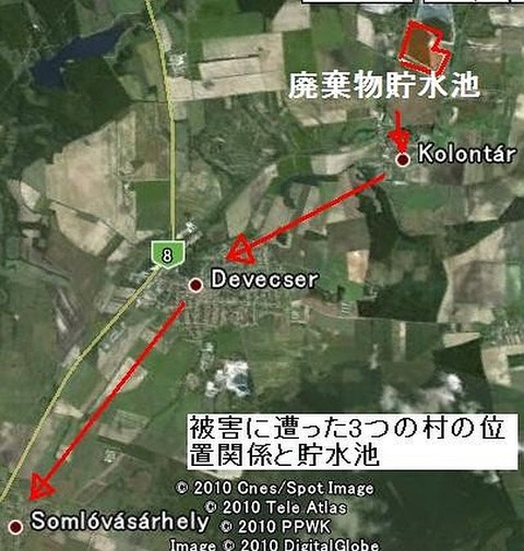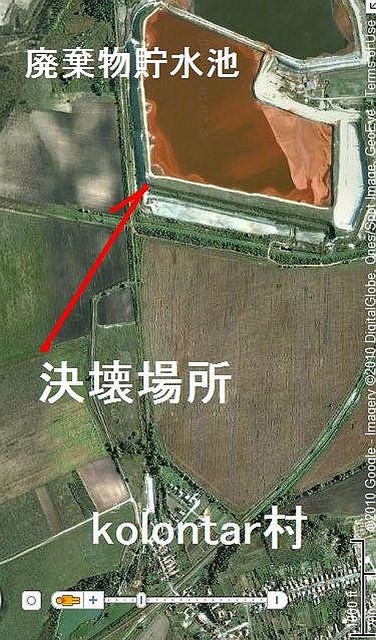 2010年10月7日:ドナウ川支流の マーチャル川Marcal Riverを経て、72km先のドナウ川the Danubeに有害な廃棄物(シアン化物cyanideを含む)が流れ込む可能性の高い事が支流のアルカリ濃度の測定で確認された。現在少しでも中和するために支流に大量の石膏を投入しているが、周辺は雨模様という悪条件となっている。現在死者4名、負傷者120名、行方不明3名、全壊家屋34棟だが、これから被害を受けたコロンタールKolontar村など3つの村(Kolontar, Devecser ,Somlovasarhely )の補償が問題になるが、村民の多くは死の街と化した状況に今後の定住には否定的だ。所有地は有毒物に覆われ、土地の価値は無くなり、住み続ける意味が無いと主張。約300mX460m以上の巨大な廃棄物貯水池は災害対策上3重に囲まれていたが、決壊当時、汚泥が高さ約2mのツナミとなってコロンタール村を破壊した。下2枚の図は決壊前のグーグルアースから摘出、加筆したもの。