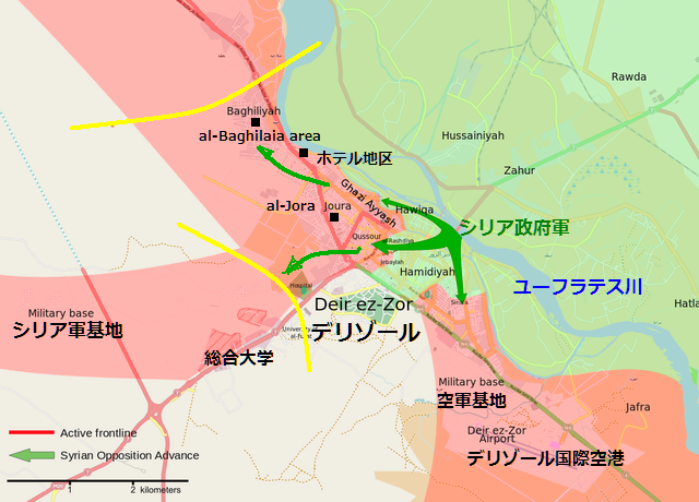 1月16日以降の戦闘で、デリゾール市 Der-Ezzor city、アルバガリヤ地域al-Baghilaia areaでは、ISに処刑された政府軍兵士48人を含む200人、ISに、30人の自爆兵を含む、少なくて110人の死亡者が出たとされ、21日の記事では、それまでの5日間の戦闘で、約440人が死亡したとされる。後退に際しISは、両地域で人質にしていた400人のうち、女性や子供、高齢者を含む270人を解放したとされる。上の左は、当ブログで編集したもので、記事を読み合わせると、シリア政府軍は緑色の方向へ攻撃し、ISの最前線は黄色い付近まで