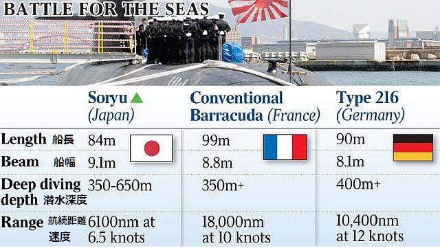 日独仏が受注を争うオーストラリアの次期潜水艦の共同開発相手選定で、オーストラリアの元政府高官らが22日までに、海上自衛隊の「そうりゅう型」ベースの潜水艦が「長期の戦略的利益」にかなうと米政府高官らが考えていると指摘した。米保守系外交誌ナショナル・インタレスト(電子版)に、アボット前豪首相の外交アドバイザーだったアンドリュー・シアラー氏と、米戦略国際問題研究所のマイケル・グリーン上級副所長が寄稿した。両氏は「米政府は(公式には)いずれの国にも肩入れしていないが、そうりゅう型は卓越した性能を持ち、米国製の戦闘システムを搭載して日米豪で相互運用すれば長期の戦略的利益になることに疑いはないと、米政府高官や米軍幹部はみている」と指摘した。一方、ドイツ、フランスは外国への潜水艦輸出経験の豊富さが強みとされる。オーストラリアは今年前半に共同開発相手を選ぶ方針。(共同)以上、2016年1月21日産経記事 英文の図の性能比較は正確ではないので参考程度に。そうりゅうの水中速度は20ノットとの記述もあり。総投資額約500億豪ドル $50 billion (米ドル$34.55 billion:約4兆円) .とも言われる潜水艦に関し2016年1月25日のオーストラリアの記事を見ると、米国の「米国製の戦闘システムを搭載」に関しては「 最も最新、高度な the most advanced US combat systems」と記述している。興味深いのは、ドイツをNATO軍の優秀な一員としながら、米国側の懸念として、ドイツの技術は中国の産業スパイに晒されている懸念があると書いている。