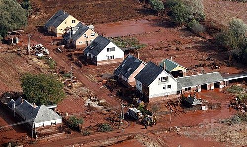 この有毒な赤い泥水はアルミニウムを精製する過程で出た廃液で、貯水池には、今回の事故で流れ出なかった泥水250万トンがまだ残っており、決壊した部分もそのまま放置されていた。堤防はコンクリート製ではなく、有害な泥水と同じアルミニウムの精