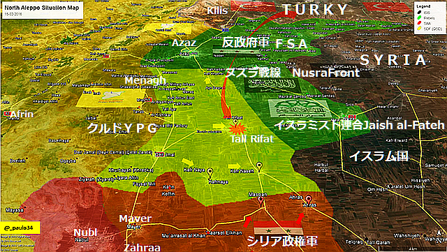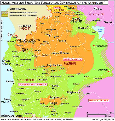 2016年2月23日:シリア政府軍は、2月22日にIS系勢力に最近遮断された首都ダマスカス方面からとアレッポを結ぶ唯一の幹線道路を同日奪還したと公表した。図の赤い点で示した、ハナセルーイスリアKhanasser-Ithriyah間の道路はまだ封鎖されている。ISは、東の支配地域からイスリア方面に侵入して北上し、「ハナセル北部ではまだ戦闘が続いており、道路がテロリストに攻撃される可能性もある」と消息筋(写真右)。ISらは道路の一部に地雷を設置しており、専門家らがすでに可能な範囲で地雷の撤去を始めている。この道路はシリア軍のアレッポへの補給路として、また同市が食料、燃料その他の必要品を受け取るためのライフラインとして唯一のもので、政府軍のアレッポ付近の戦闘にも大きな影響がある。アレッポ周辺では、数箇所の村が孤立し、物資や食料が欠乏し、国連支援が急がれている。シリア軍の見方では、テロリスト(IS)らはアレッポ補給ルートの遮断によりアレッポ北部とラッカ西部におけるシリア軍の大規模攻撃のペースを遅らせようと画策したとされる。