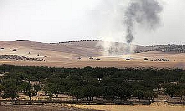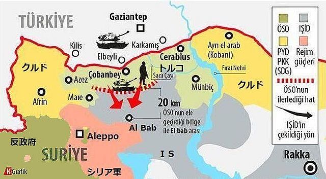 上の地図は多少古い戦況図にトルコ語の地名を一部英語表記に訂正したもので、アレッポ周辺の戦況が多少違うが、トルコ軍の侵攻は大体、図のようだと把握している。この地域には、実際は穏健派反政府組織やシリア軍がかなり複雑に入り組んでおり、穏健派イスラム組織のリーダーが「戦っている自分たちでさえ、今誰が敵なのか分からないほど複雑だ」と、それまで対ISで仲間と思っていたクルド・ペシュメルガPeshmerga軍に攻撃され戸惑っていた。そのペシュメルガPeshmerga軍は、ラッカRakka(Raqqah)攻略でシリア政権軍Syrian regime forcesと共闘するようだ。写真上は、シリア領へ侵攻するトルコ戦車群トルコの言う「空爆」が起きたのは24日未明3時半ころとあるので、誤爆の可能性もあるだろうが、確実な所は不明だ。