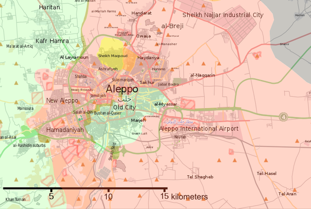 2016年12月1日付けで公表されている資料では、アレッポ東部、Hanano地域一帯はシリア政府軍、及びシリア民主軍SDF(クルド主導のアラブ系反政府組織だったが、IS攻撃のためシリア軍とは互いに不干渉の立場を取り、現在はシリア軍と対ISで共闘している)側に制圧され、地図の薄い緑色の部分に反政府側が孤立している。参照記事 米露は、人道的配慮から孤立地域の住民への食糧支援や残存する反政府側へ無条件での撤退(西部反政府支配側への移動)を促すための協議に入ったとされる。