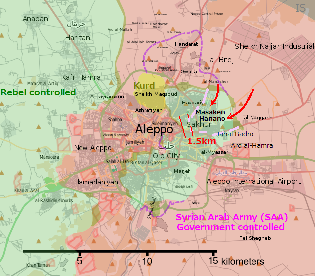 マサケン・ハナノ地区の奪還は、12日目を迎えた政府軍の大規模作戦の一環で、政府軍の精鋭タイガー部隊Tiger Forcesによって行なわれ、これにより同地区はその南側の反体制派支配地域から分断される可能性があり、さらにこの精鋭部隊は東部のSakhour , Jabal Badro、 Ard al-Hamra地区の完全制圧に注力し、アレッポ制圧後はシリアのほかの地域の攻撃に移ると報じられている。この部隊は2015年春ころから、Homs、Idlibでも戦果を挙げている。