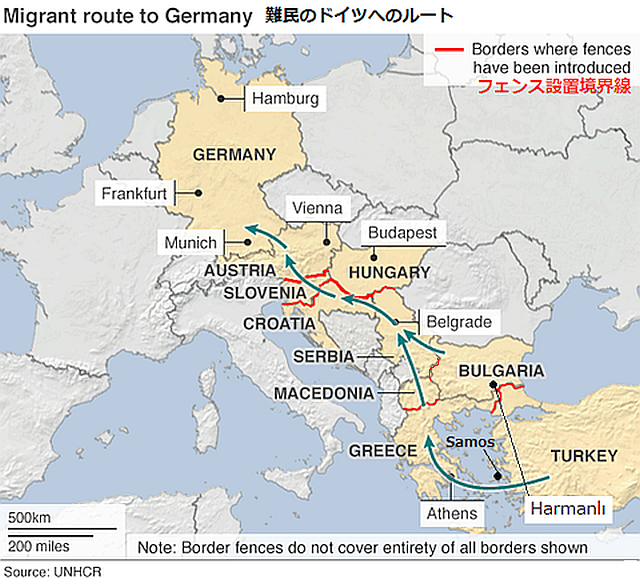 EU各国は去年9月、ギリシャとイタリアにいる難民16万人を各国が分担して引き取ることを決定したが、各国の態勢が整わないことや、受け入れに否定的な国が出ていることなどから、11月時点で受け入れ先が確定してキャンプを出たのはわずか6925人だけだった。アフリカなどからギリシャへとたどり着いた難民の多くは足止めされ、先の見えないまま日々を過ごしている。ドイツには去年、約100万人が流入したが、受け入れに積極的だったメルケル首相への国民の不満が相次ぎ、極右政党の支持が拡大し、オーストリアでも移民排斥を訴える極右政党が支持を拡大中で12月4日に行われる大統領選挙の決選投票では、極右の大統領が誕生する可能性も指摘されている。映像:摘発されたトルコから徒歩でブルガリアへの違法入国者 参照記事