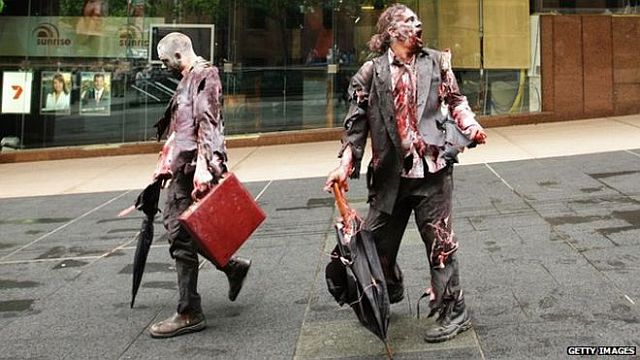 似た様なことは、2012年11月に英国紙が書いていて、その時のタイトルは「ゾンビ企業が国の成長を食い潰している'Zombie' companies eating away at economic growth」だったが、それは英国内の状況を表したものだった。そのような集団ゾンビコロニーzombie colonyが経済成長を妨げ、英国の場合は、経営悪化で金融債務の利払いしか出来ない企業だけでなく、多くの一般家庭が収入不足で返済金の利払いしか出来ない、または返済できない状態も意味している。当時の英国には、そのような、倒産はしていないが投資して経営を活性化できる資金も無いゾンビ企業が146000社あると書いている。結局英国は、経済の悪化から失業率の高騰など悪循環から脱却できずにEU離脱の方向に至り、今現在非常に実験的でリスクの多い経済改革に向かっている。参照記事