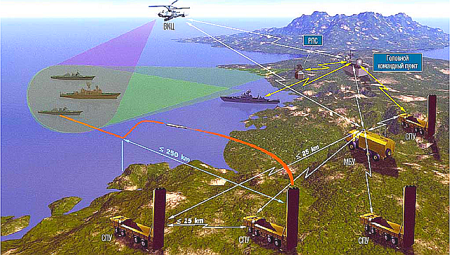 300km (低空巡航のみで120km)(超音速対艦ミサイル「オーニクスОникс」「輸出型:ヤーホントЯхонт」の地上発射ヴァージョン):択捉島へ 映像:写真左」がクリル諸島のイトゥルプ(択捉島)、クナシル(国後島)両島に配備されたことが明らかに
