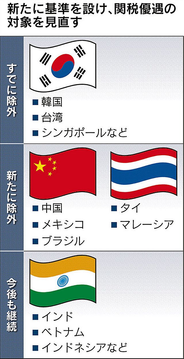 現在、特恵関税制度は3年連続で高所得だった国および地域を対象から除外している。日本はここに新たに「高中所得国に分類され、かつ