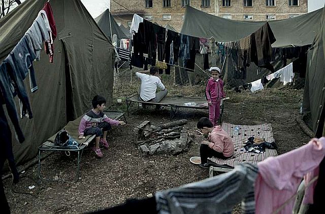 欧州の入り口、ギリシャや」ブルガリアが受け入れや通過をいくら制限しても、シリアやイラン、アフガニスタンなどを逃れてトルコへ入った難民たちは、更にゴムボートでエーゲ海を渡り、今も多くが欧州を渡ろうとする。去年1年間で10万人以上がエーゲ海を渡ろうとしてギリシャ領サモス島Samosに到着した。違法入国と出国を制限するため、難民は頑丈なフェンスで囲まれたキャンプに収容されされ:写真下、キャンプの定員は850人だが、今は3倍近い2450人が住んでいる。アフガニスタンからの難民の一人はすでに7ヶ月、出国できずにキャンプに住んでいる。