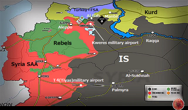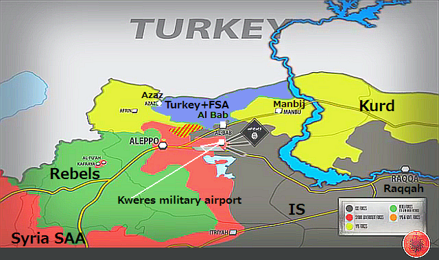 2016年12月27日:ISの空軍基地攻撃は北部、アレッポ東部のクワイリス空軍基地Kweres military airport でも行われ、シリア軍が激しい自爆攻撃を受けていると報告されている。左下は、12月24~27日前後、最近のシリア北部の勢力図と見ていいだろう。この図では、Manbij付近はクルド制圧地域になっているが、トルコの影響下にあるとの解釈もある。トルコは、国境から南へ約30キロのAl BabからManbijに抜ける東西のライン北部をセーフゾーンと主張し、Al Babを攻めるISへ越境空爆を行い、これら一連の軍事行動を「ユーフラテスの盾作戦:Operation Euphrates Shield」と称し、2016年8月末から展開している。この図は、既存の図を筆者が12月27日編集したもの。 参照記事 参照記事 拡大地図 参照記事 参照記事 過去ブログ:2016年12月ホムス東部でシリア軍とISが激戦 シリア