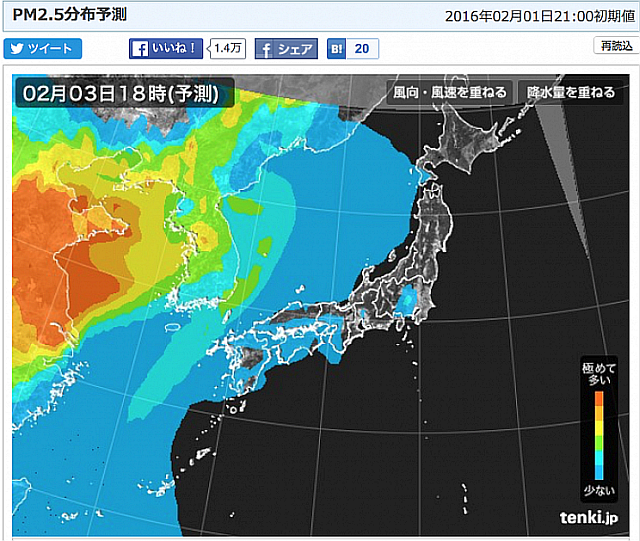 吸っているのに該当し、中国で毎日4000人が大気汚染が原因で死亡しているとされ、これは中国全体の死亡者の17%になる。上の図は2015年のもので、現在はこれより更に深刻な状況になっている。日本の環境基準値は 1日平均値が35μg/m3以下で、我が家のある札幌の北での12月24日9時の平均は7μg/m3となっている。日本の北だが、これからは右の図ように大陸からの汚染の影響を受けて数値が高くなることもあり、決して他国のこととは言っていられない。 過去ブログ:2016年12月世界各国で大気汚染が深刻化 参照記事 参照記事 参照記事2016年12月26日:中国の立法機関、全国人民代表大会(全人代)は25日、同国初となる環境保護税を2018年から導入する法案を可決した。中国では大気や土地、水質の汚染問題に政府が有効な手を打てていないことに国民の間で不満が高まっている。