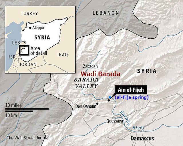 シリアの首都ダマスカスやその近郊の水源Springは、北西へ15キロの、紛争前は渓谷Barada Valleyを見に観光客も多く訪れたWadi Barada地域のAin el-Fijah(Ein Al-feejeh)にあるal-Fijah springを水源としている。過去2011年には、反政府的なデモをここの住民も行ない、それ以降このWadi Barada地域一帯には反政府側の拠点があるが、支配地の住民への影響を考慮してか、これまで反政府組織によって水源の破壊や汚染はなかった。しかし最近、反政府側が水源に軽油を入れ汚染されたことで、人口約500万人のダマスカスで飲料水の供給が12月23日からストップした。反政府側はこれを否定し、政府側の空爆で軽油が川へ流れ込んだとしている。水源地域の10箇所の村が2012年から反政府側の支配下にあり、地域住民も反政府的だと言われ、この数日前12月23日に、アサド側はこのWadi Barada地域の、水源springsのあるEin Al Fijehに樽爆弾をヘリから投下している事から、報復攻撃の可能性もある。