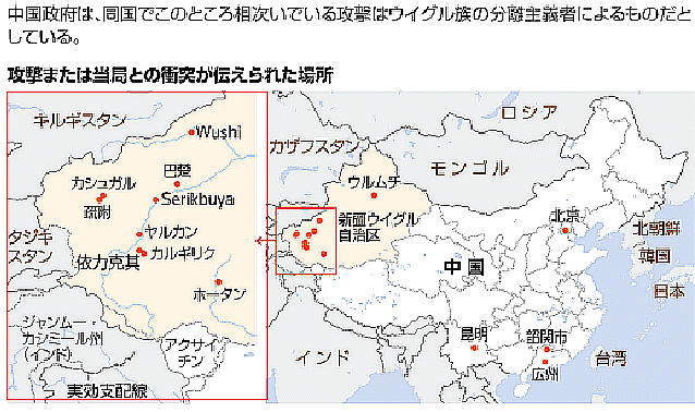 襲撃したのは、56万人の人口のカラカシュ(墨玉)県で97%を占めるウイグル族(Uygurs 為維吾爾族人)との情報もある。同自治区ではこれまでたびたび警察や検問所などへの襲撃が発生し、多くの死者が出ている。中国当局はこうした事件をイスラム独立派によるものとし、少数民族ウイグル族への締め付けを強化している。 参照記事 参照記事 参照記事:新疆墨玉縣遭炸彈襲擊 4暴徒被擊斃 過去ブログ:2016年10月中国の核実験場となったウイグルで核汚染 広島の1300倍投下 2015年5月追記:2014年7月新疆地区で宗教者、住民1000人が殺害か? 4月中国がパキスタンへ歴史的大型投資と国境、民族、宗教問題 2014年5月新疆ウイグル自治区へ過去最大の警備、弾圧開始 中国