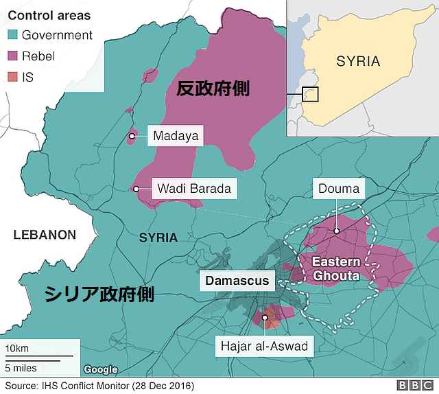 2017年1月6日:水源を奪取されてから2週間が経つが、地形の険しさが反政府側に有利に作用し、空爆を繰り返すもシリア軍は水源を奪還できていない。ダマスカスでは、外部からタンクで水を運び込んだり井戸を掘ってしのいでいる。反政府組織は、イドリブへの攻撃を止めない限り水源地の開放にも停戦にも応じないとしている。 水源地域からの水がダマスカスを流れるバラダ川Barada river:右 を形成している。参照記事 参照記事
