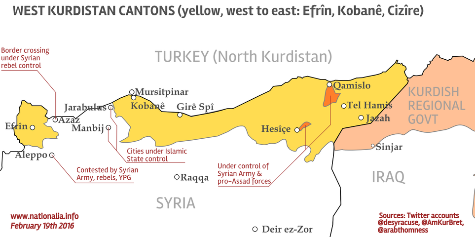 Al-Fateh(旧名ヌスラ戦線Al-Nusra Front)系組織を排除した内容で早い決着を見たといわれている。 北部クルド勢力は、連邦制国家「西クルディスタン West Kurdistan (Rojava) 」樹立に向け、選挙実施などの用意を始めたと報じられている。 右の西クルディスタンの領域は2016年2月に公表されたもので、現在クルドが支配するといわれるManbij付近は省かれており、今後クルドが領土として主張するのかは不明。トルコ側が認めない公算が強い。本来のクルド主張の西クルディスタン領域は左側で、トルコ国境沿い全域となっている。参照記事 参照記事
